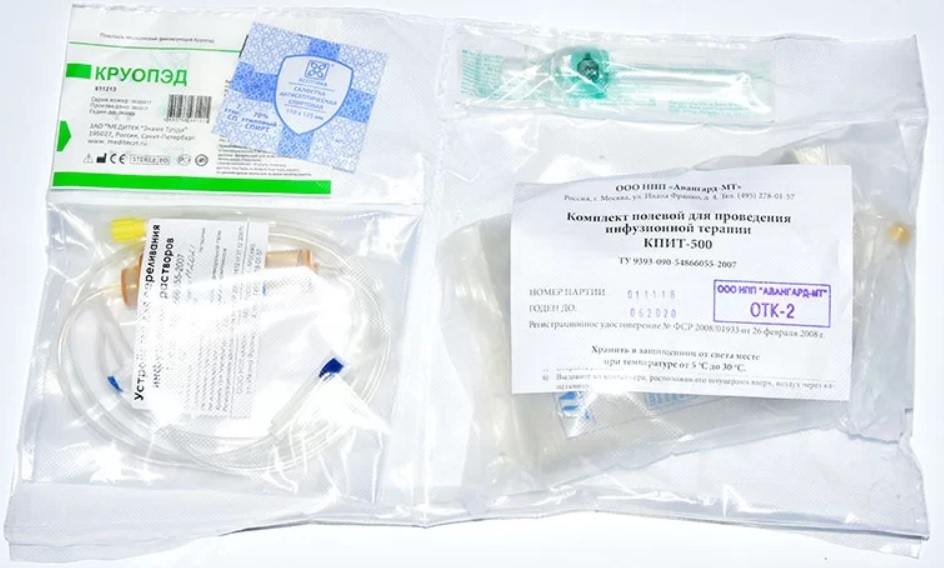1) Комплект для проведения инфузионной терапии (раствор натрия хлорида 0,9% 500 мл в полимерном контейнере, устройство для переливания инфузионных растворов, внутривенный катетер G18 с дополнительным портом, 2 спиртовые салфетки, пластырь для фиксации катетера, медицинские перчатки стерильные). Входит в комплектацию сумки врача ( 4 шт. по 500 мл). При острой кровопотери допускается вливание до 1 л инфузионных растворов. При этом важно понимать, что при инфузии разбавляются все элементы крови (при кровотечении нам в первую очередь важны тромбоциты – остановка кровотечения и эритроциты – доставка кислорода к тканям).