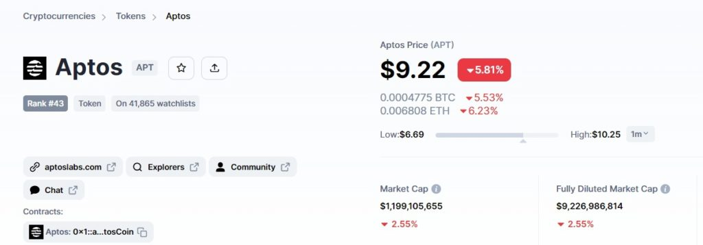 Не сказать, что биржи очень способствовали хайпу Aptos. Они не делали каких-либо маркетинговых кампаний, а просто залистили токен. В первую минуту цена поднималась до 59$, а потом скачками постепенно опускалась. В итоге зафиксировалась на стоимости 7~9$, и сейчас торгуется примерно на этой отметке.