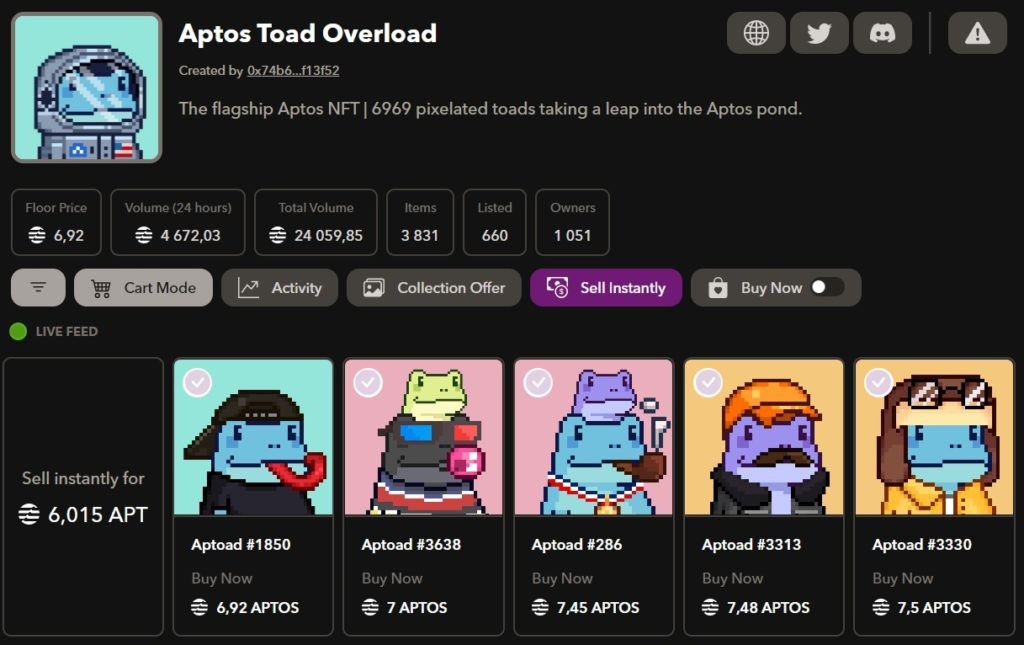 Пример ректа — Aptos Toad Overload. Они торгуются уже в -60% от цены минта и врядли когда-либо распродадутся с сапплаем 6969 NFT и ценой минта в эквиваленте 85$.