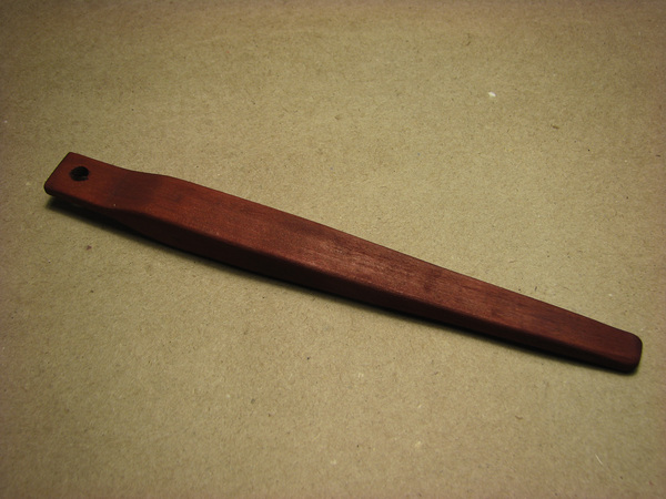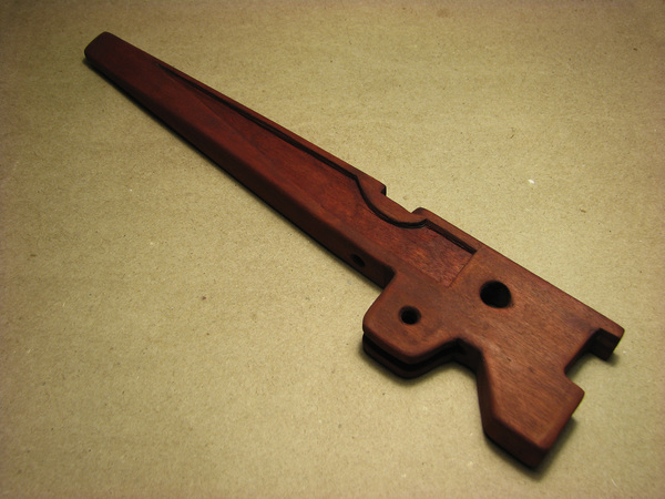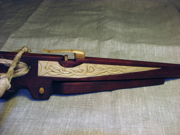 Теперь вернемся к ложу и дуге. Основа уже была готова, дуга работала, тетива есть, но ложе пока что представляет из себя просто деревянный брус. Посмотрев на картинки, я выбрал такую форму. Спусковой рычаг крепится деревянным штифтом в пропиле и толкает штырь. Выступ под дугой носит скорее декоративный характер, ну а дальше ложе становиться тоньше, идет скос, но все это просто для красоты. Выпилил ложе, отшкурил до 1000, просверлил отверстия под штыри, сделал спусковой рычаг и пропил под него, подогнал все, чтобы нормально двигалось. Потом привязал дугу и решил провести небольшие испытания.