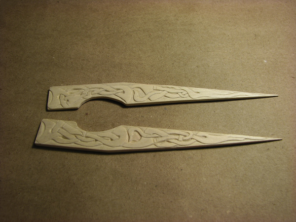 Все работало, как следует и можно было спокойно заняться украшательствами. Я изначально решил, что хочу сделать вставки с резьбой, все-таки этим занимаюсь. Но таких вещей я никогда не делал, собственно сложность такой инкрустации просто в том, что нужно руками подогнать вставки в выемки под них. Сделав это, я вырезал подобранный узор. Это стилизация древнескандинавских орнаментов X века.