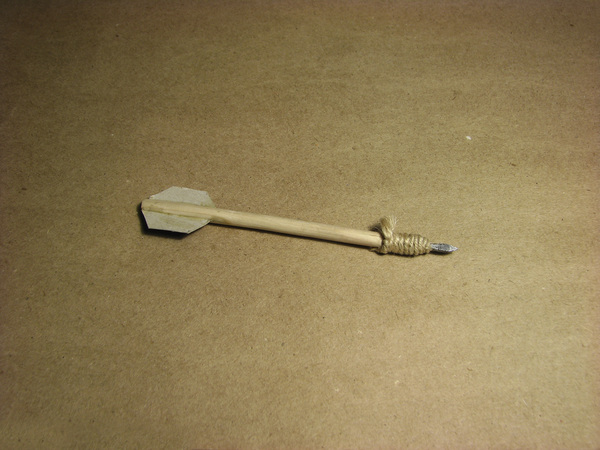 Также стоит сказать и о болтах для арбалета. Сделал я пока всего один, больше не нужно как-то было. Сделан он из остатков липы, оперение картонное. Наконечник сделал из гвоздя, расплющенного молотком и подогнанного под нужную форму. Оперение вклеено столярным клеем, наконечник на эпоксидке с дополнительной проклеенной обмоткой пеньковой веревкой. Схема болта нормальная, работает, выдержал несколько десятков выстрелов в доски, умирать пока не хочет.