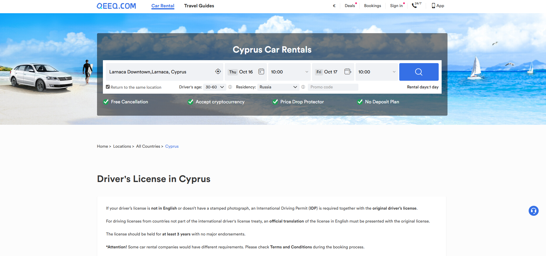 Qeeq часто радует акциями и «секретными» тарифами, где цена видна только после авторизации. На Кипре у сервиса приличный выбор — как у международных компаний, так и у местных партнёров. Удобная фишка — клубная подписка с кешбэком и приоритетной поддержкой: если часто путешествуете, оно окупается буквально за сезон. В интерфейсе хорошо вынесены условия по депозиту и франшизе, а фильтры позволяют отсечь странные варианты уже на этапе поиска.