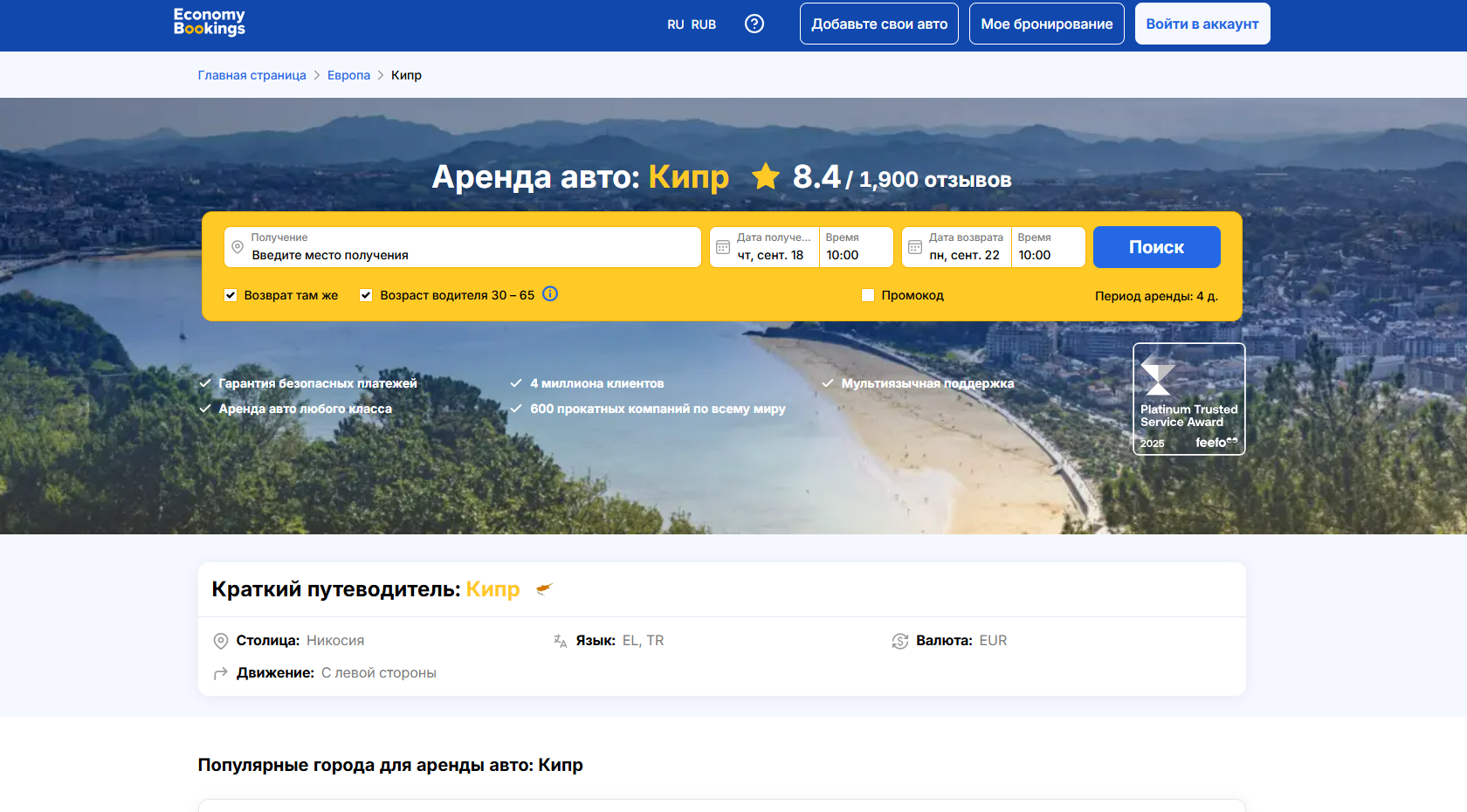 Знаковый плюс EconomyBookings — широчайшая сеть партнёров и полезная политика отмены. Это помогает ловить хорошие тарифы заранее, а если планы поменялись — вернуть деньги без нервов. По моему опыту, именно здесь часто всплывают интересные предложения средней ценовой категории с нормальными депозитами и читабельными договорами. Интерфейс понятный, фильтры гибкие, на Кипре много пунктов выдачи и у аэропортов, и в курортных зонах.