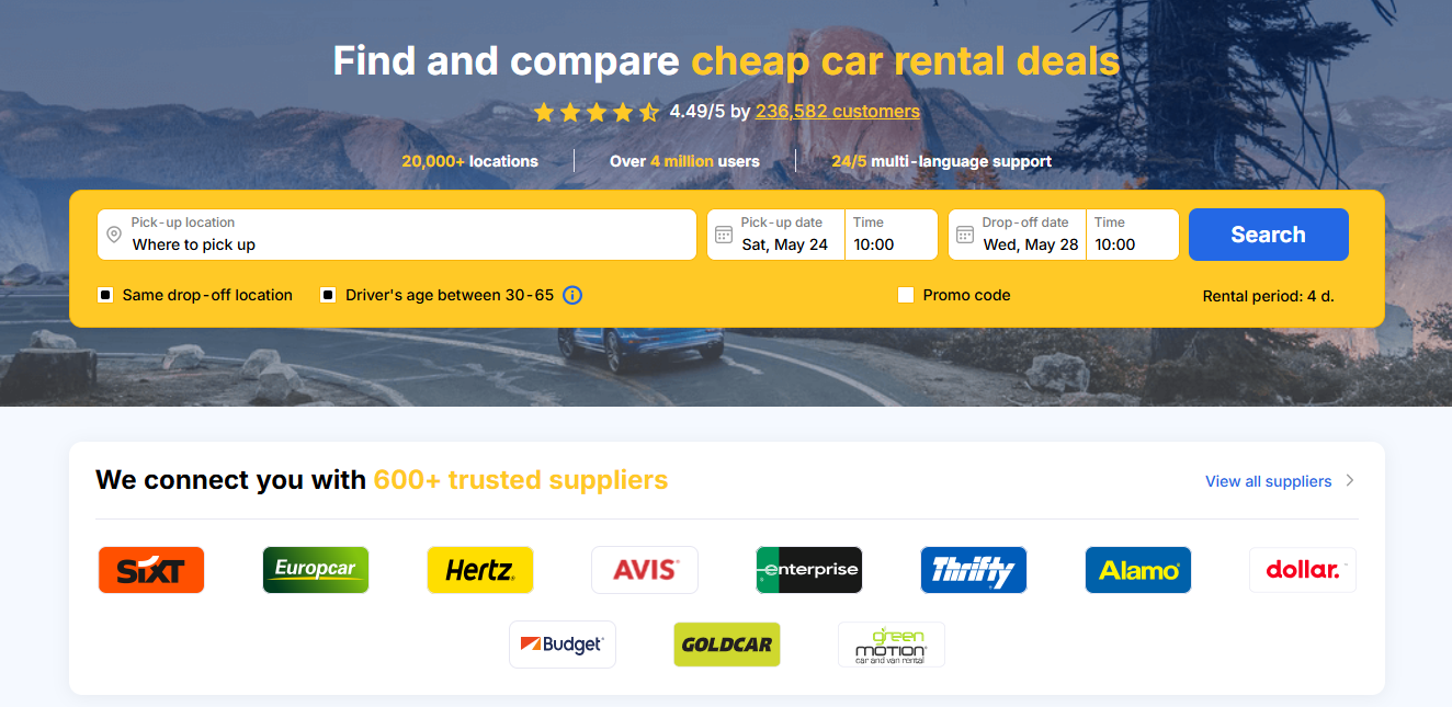 🏅 Localrent— аренда без депозита, поддержка на русском и честные цены.🥇 EconomyBookings— глобальный агрегатор с большим выбором авто и гибкими условиями отмены.🥈 QEEQ— бронируй машину за $1 и получай компенсацию, если цена упала.🏅 BookingCar— локальный выбор авто с возможностью аренды без водителя.🥇 РосАвтоПрокат— прозрачные условия, быстрая подача авто и техподдержка 24/7.