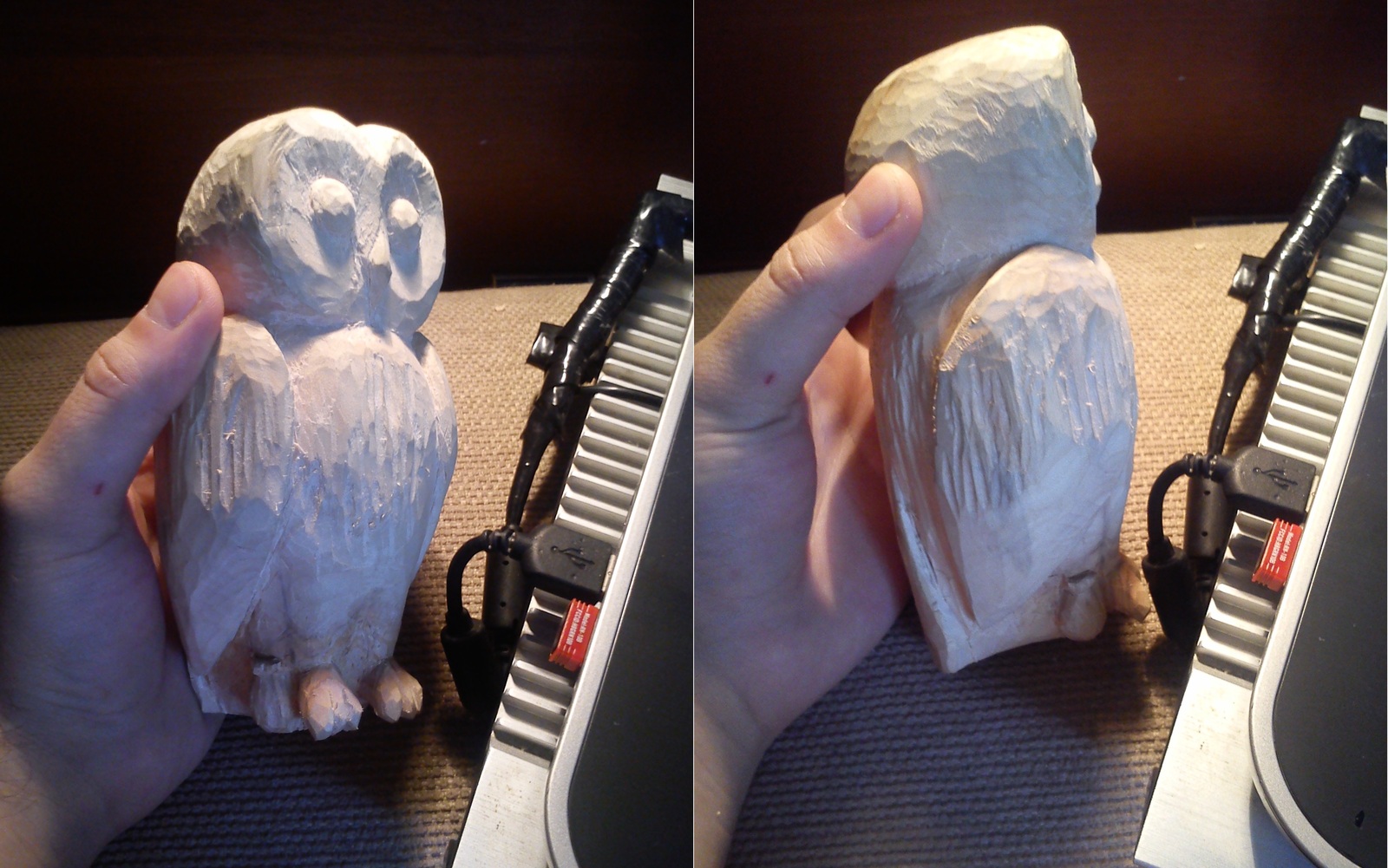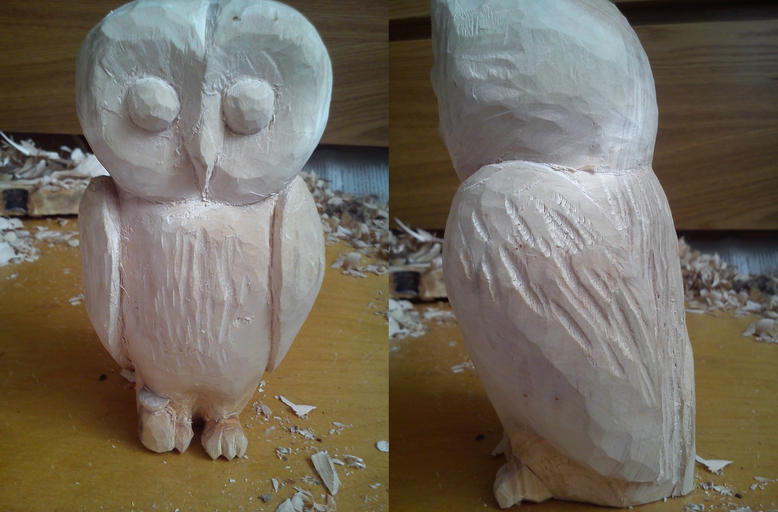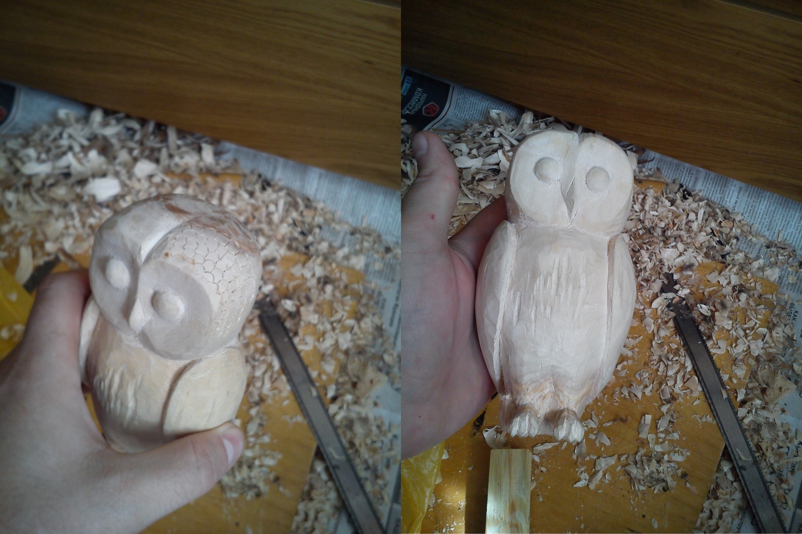 Срезал нафиг почти все набивки. Оставил только у глаз. Резцом попытался нанести риски, для имитации оперения.Получилось фигово. Нужен нормальный инструмент. Кирайские резцы бесят. Заминают, не держат заточку. Да и геометрия у них хреновая.