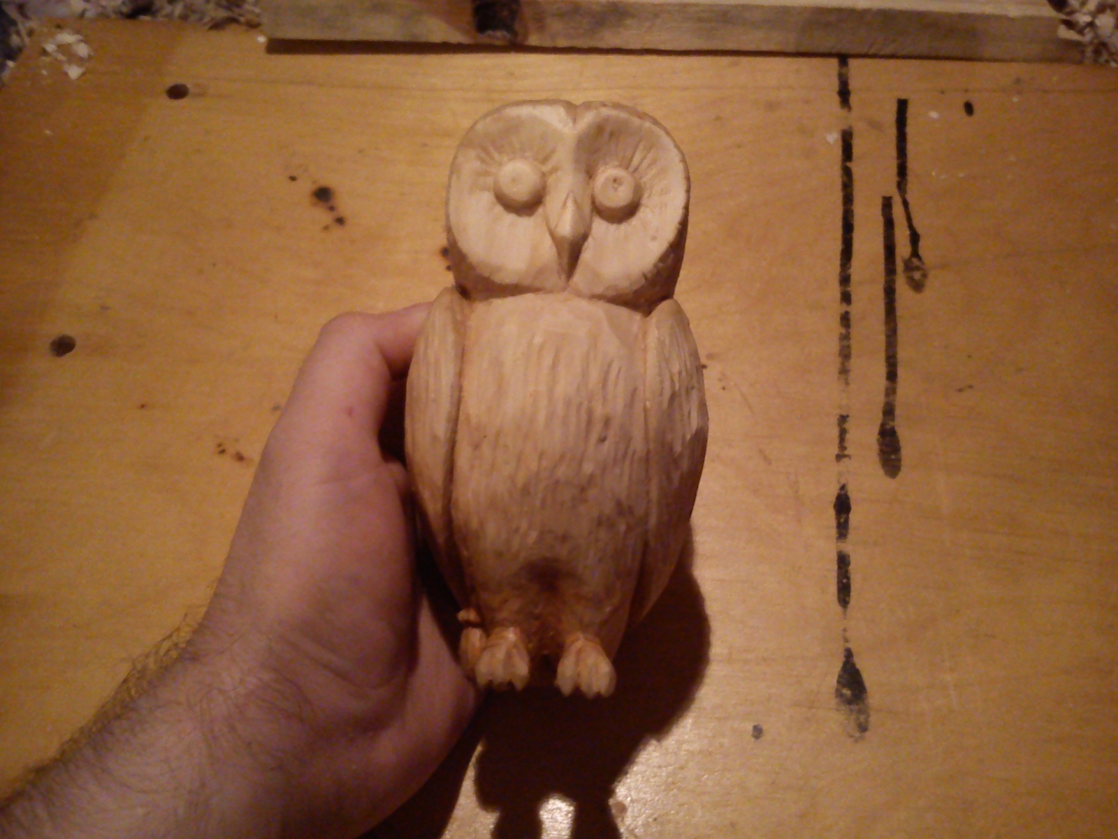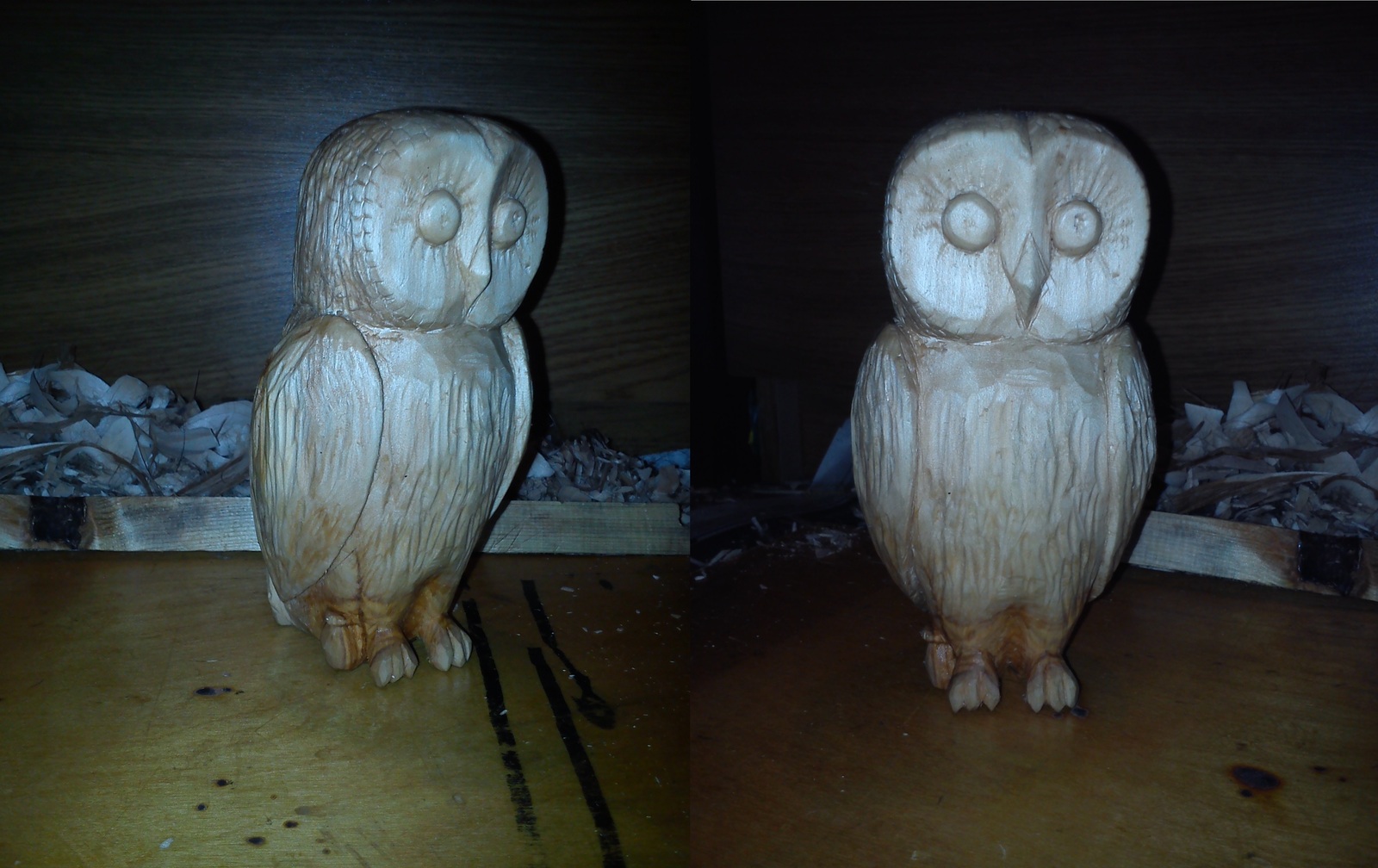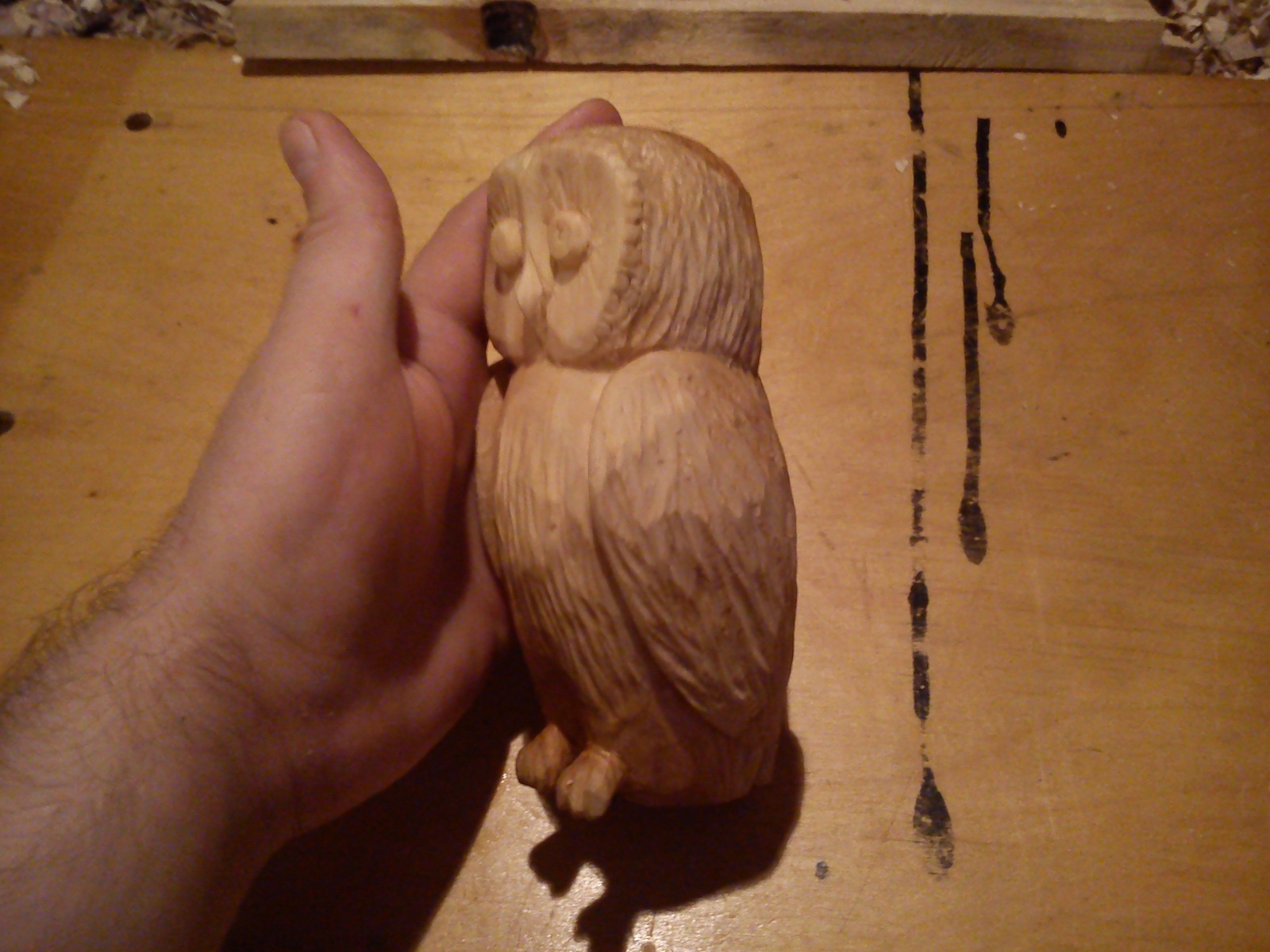 Срезал нафиг почти все набивки. Оставил только у глаз. Резцом попытался нанести риски, для имитации оперения.Получилось фигово. Нужен нормальный инструмент. Кирайские резцы бесят. Заминают, не держат заточку. Да и геометрия у них хреновая.