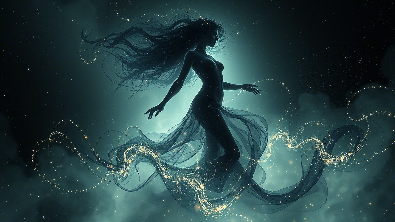 Сфера мрака начала свой танец — раскрывалась, как бутон цветка. Она распрямилась, раскинув руки в стороны. Тьма обрела облик женщины в темном платье, извивающемся, будто тысячи щупалец, которые то впивались в воздух, то скользили мимо, пытаясь ухватить невидимые нити бытия.