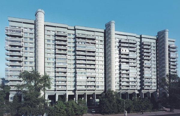 Один из самых ярких примеров московского брутализма. Здание из сборных железобетонных элементов покоится на мощных сужающихся к основанию ногах-опорах (высотой в 4 этажа), расходящихся под углом в стороны. Вынесенные монолитные лестничные клетки с окошками-бойницами имеют своеобразную нарочито грубую фактуру, сохранившуюся от деревянной опалубки. В наши дни внешний облик дополнился ещё и хаотично остеклёнными балконами, что придаёт фасаду ещё больше брутальности.