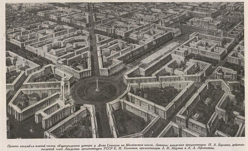 Но не только в масштабности зданий славен сталинский ампир, но и в размахах перестройки затеянной в те годы. Города ждали глобальных обновлений. В Москве расширялись улицы путем переноса зданий, строится канал им. Москвы, появляется метро. В Петербурге административный центр собираются сместить в южную часть города и для того создают план нового огромного района со своим ̶п̶о̶д̶к̶и̶д̶н̶ы̶м̶ ̶и̶ ̶к̶о̶м̶с̶о̶м̶о̶л̶к̶а̶м̶и̶ Домом Советов.