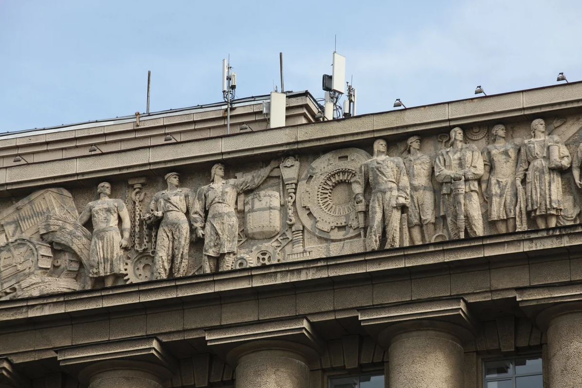 В этих районах стали появляться новые высокие, статные здания. Вновь вернулся внешний декор. Если в дореволюционные годы здания украшают скульптуры богов и женские лица (помним про макароны), то новым богом в Советском Союзе становится рабочий человек. Именно фигуры рабочих профессий мы видим в основном на зданиях тех лет (помимо серпа, молота и звезды, разумеется).