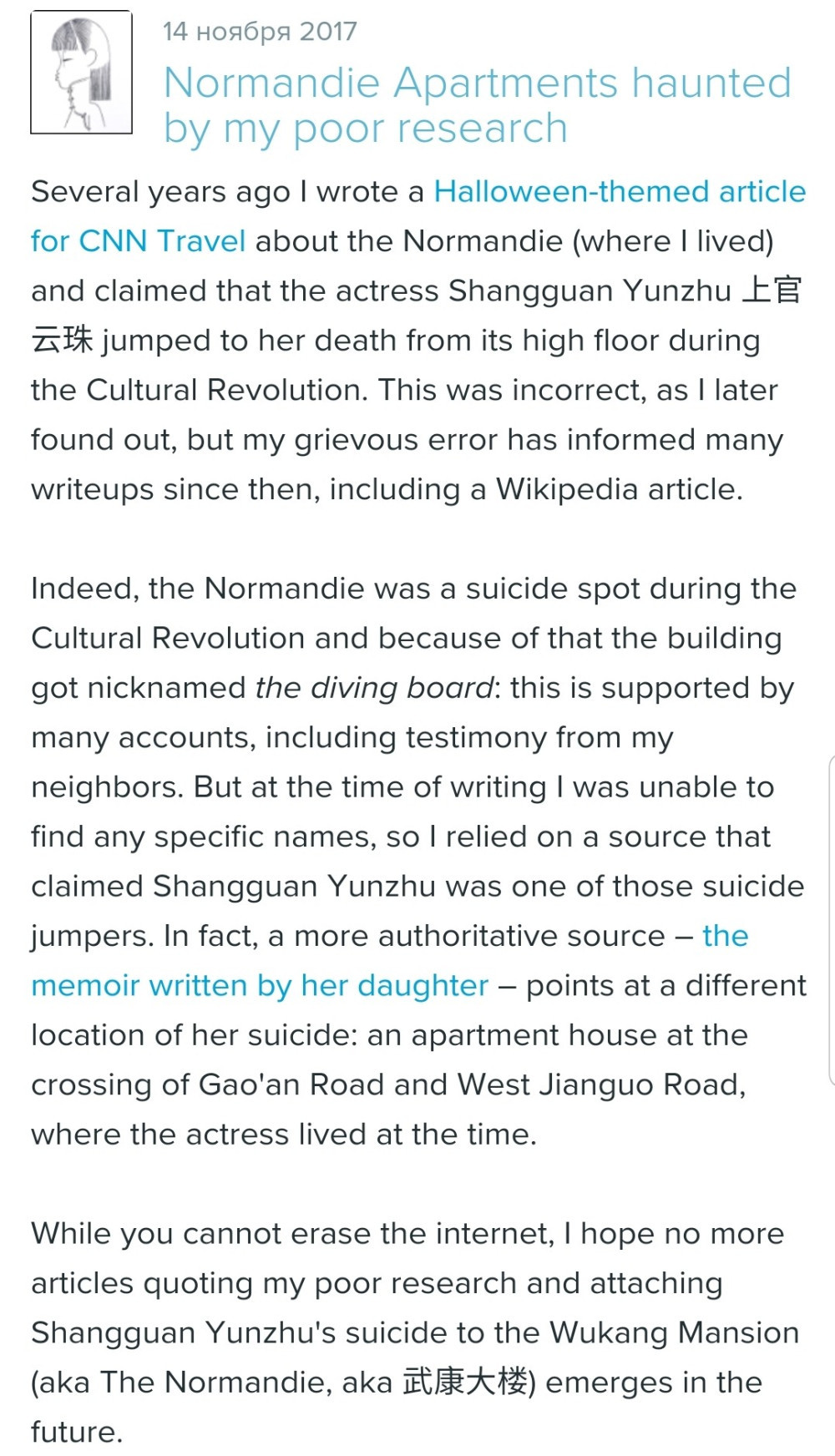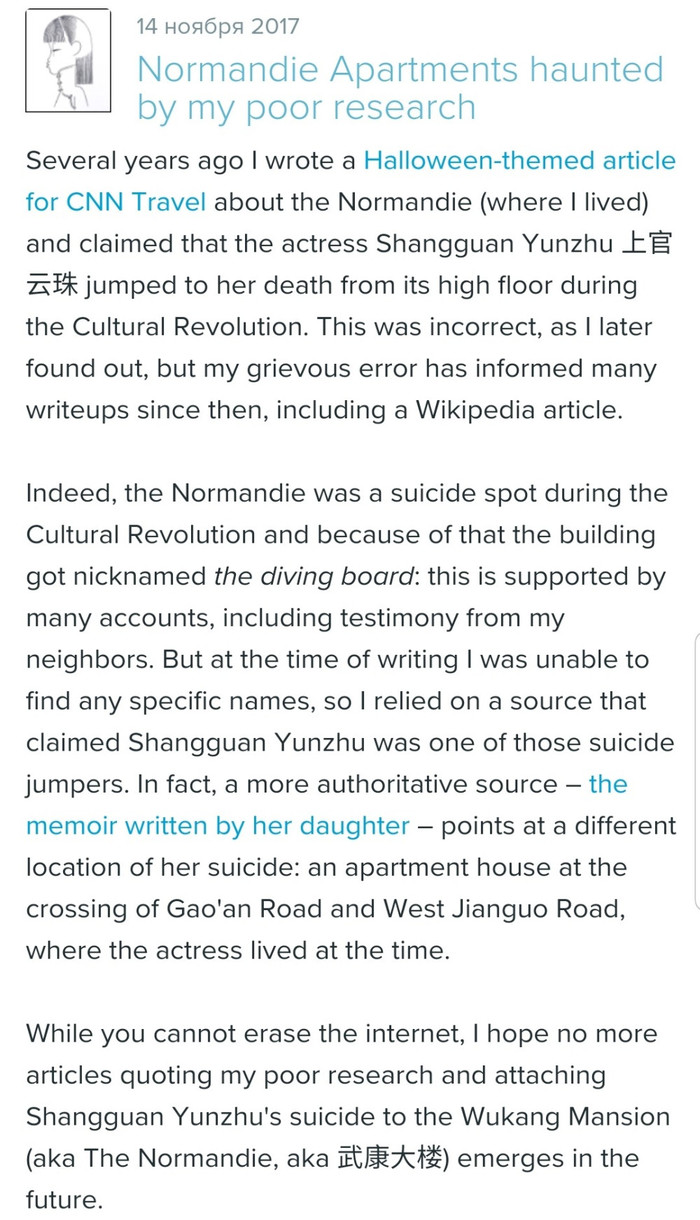 Неверная информация была обнародована Екатериной Князевой в 2009г. В своей статье она указала, что самоубийство было совершено в Wukang Mansion.