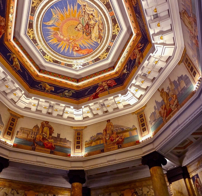 В 1955г HSBC был вынужден покинуть рынок Китая (неба небольшое время), и здание банка заняли местные власти. Роскошные интерьеры решили закрасить белой краской, чтобы капиталистическое наследие не слепило глаз. Поговаривают, что именно это шаг спас здание от печальной судьбы во время культурной революции. Позже штукатурку отбили и нашли великолепно расписанный потолок.
