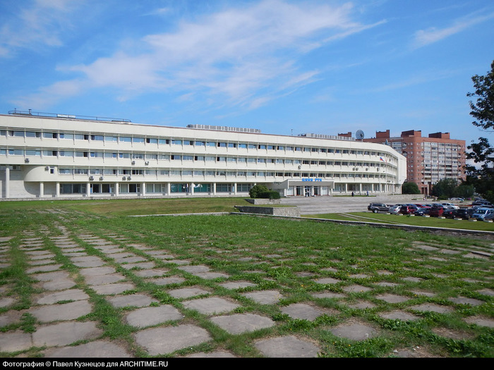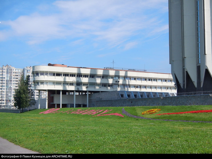 4-этажный основной корпус покоится на 1-этажном постаменте и выглядит динамично благодаря плавному изгибу вдоль Тихорецкого проспекта. Ленточное остекление дополнено "бриз-солей", системой из вертикальных перемычек, которая частично защищает помещения от попадания солнечного света, которого и без того не слишком много в Северной столице. Часть здания, выходящая на восток, на Светлановский проспект, представляет собой 2-этажный "корабль", нависающий над землей и полуподземными помещениями и покоящийся на высоких тонких колоннах.