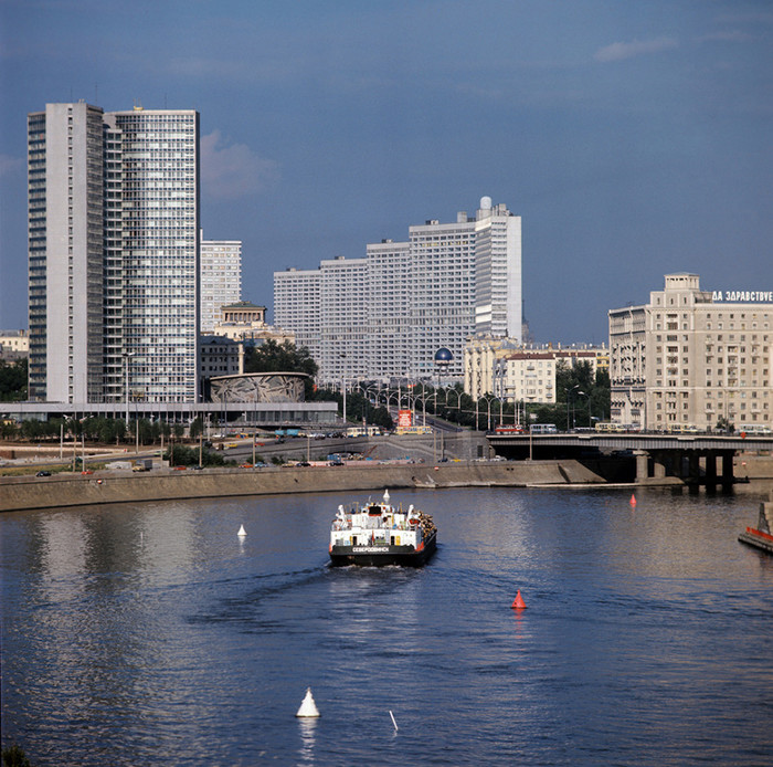 Вид на Москву-реку, Краснопресненскую набережную, здание Совета Экономической Взаимопомощи (слева) и высотные дома на проспекте Калинина, 1977 год (Фото: Валентин Соболев / Фотохроника ТАСС)