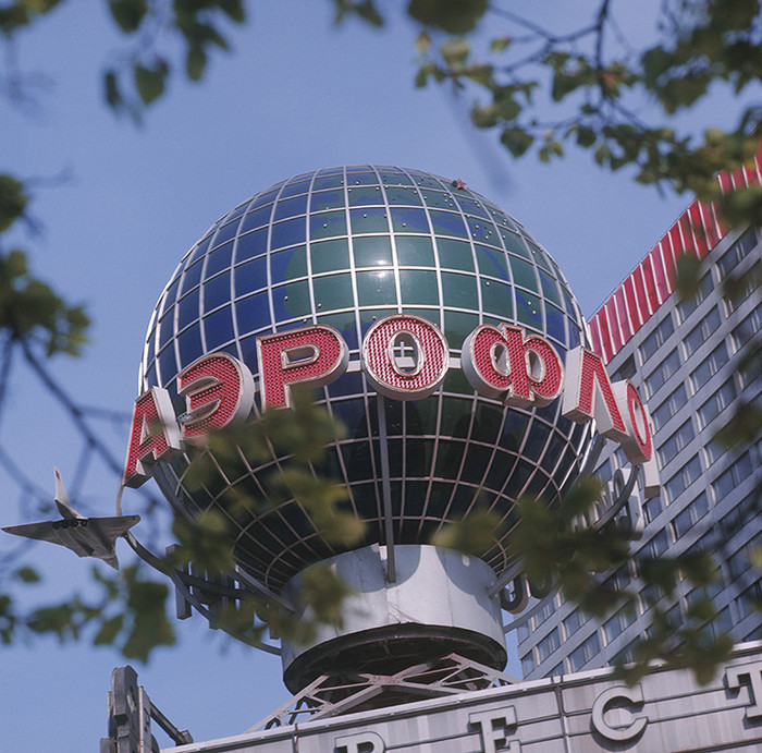 Аэрофлотовское чудо — рекламная конструкция в форме глобуса, изготовленная в Японии, — вращалось по часовой стрелке. Города, куда отправлялись рейсы «Аэрофлота», вспыхивали разными лампочками, а самолет весом в полторы тонны летал в обратном направлении. © Юрий Сомов/РИА «Новости»