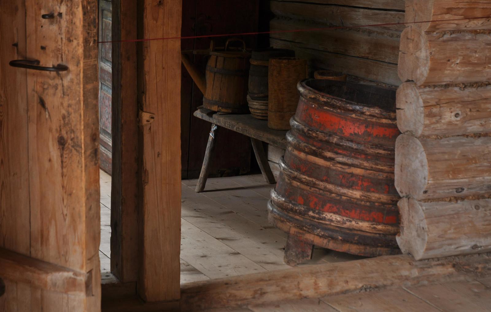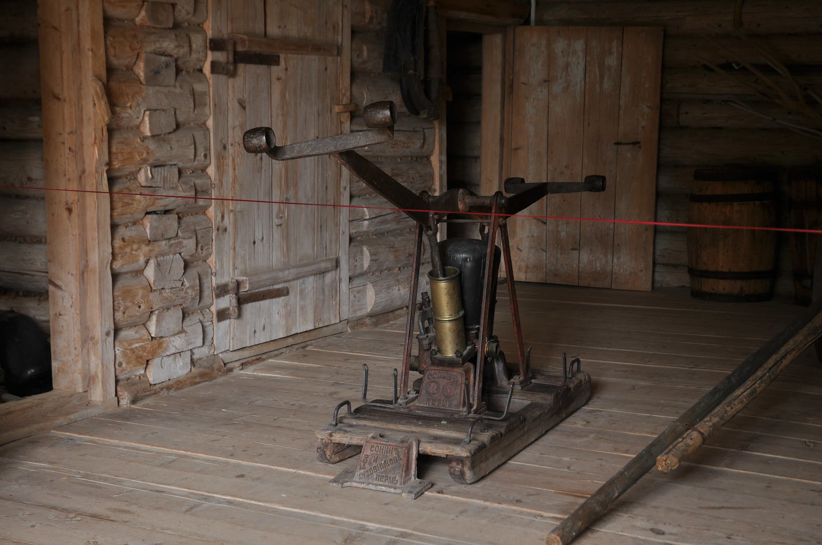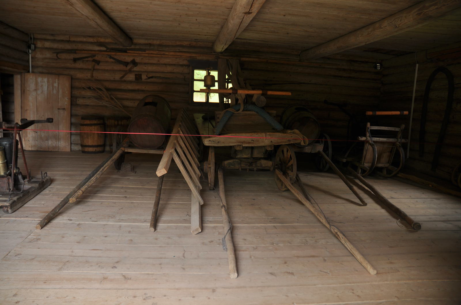Внутри представлены основные крестьянские орудия для сушки, молотьбы и веяния зерна, а также деревянная веялка и механическая молотилка - машина, появившаяся в крестьянских хозяйствах с 80-х гг. XIX в.