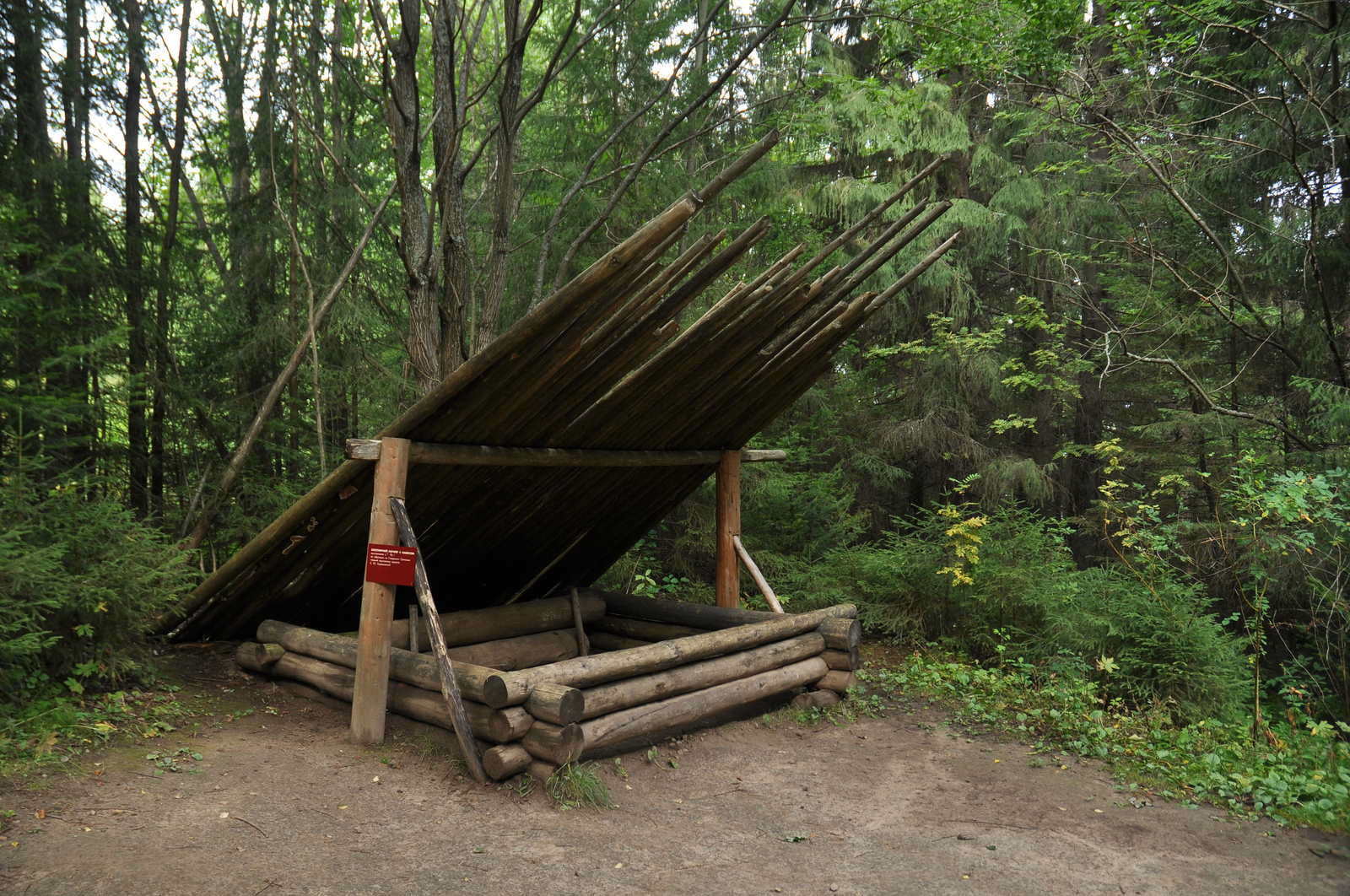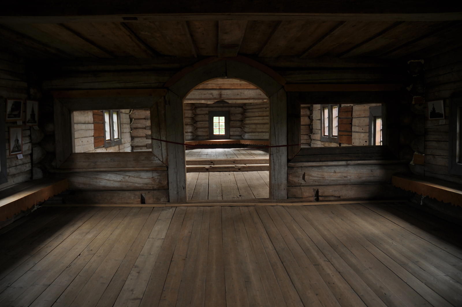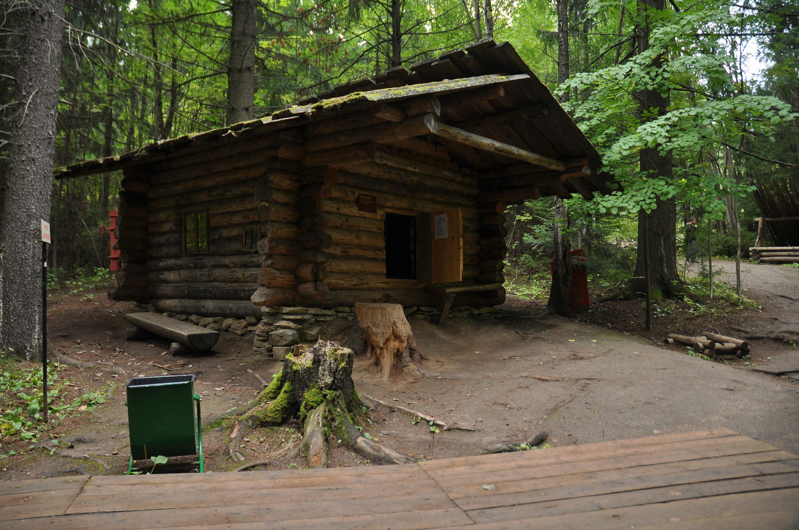 "Рублена из брёвен сосны циклопических размеров - от 45 до 80 см" - из буклета. Внутри пол из массивных плах, отёсаные стены, встроенные лавки.