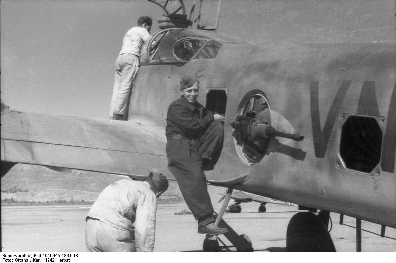 Немецкие техники обслуживают тяжёлый двухмоторный истребитель Ме-410. Хорошо видна дистанционно управляемая барбетта со снятым кожухом с установленным тяжёлым 13-мм пулемётом МG 131.