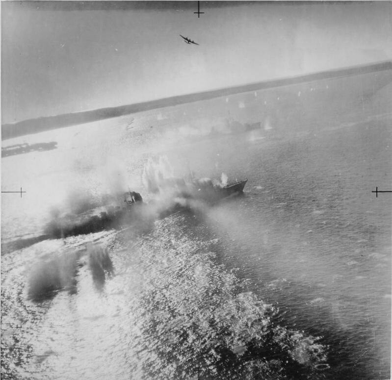Английские штурмовики "Бофайтер" атакуют ракетами немецкие эсминцы в устье реки Жиронда.