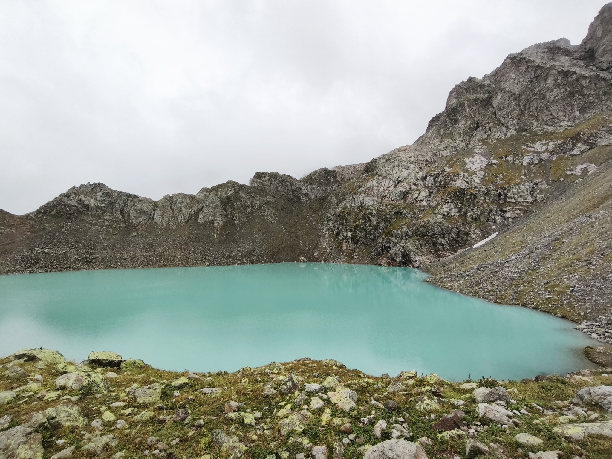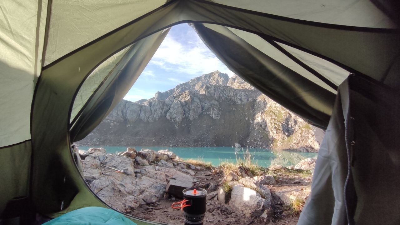 Озеро глубокое, 17 метров. Бирюзового цвета, за счёт того, что ледники перетирают камни в микроскопическую кварцевую пыль, которая затем оседает на дно и отражает свет, из-за чего получается такой цвет. Вот с таким видом на озеро мы и поставили палатку. Привал.
