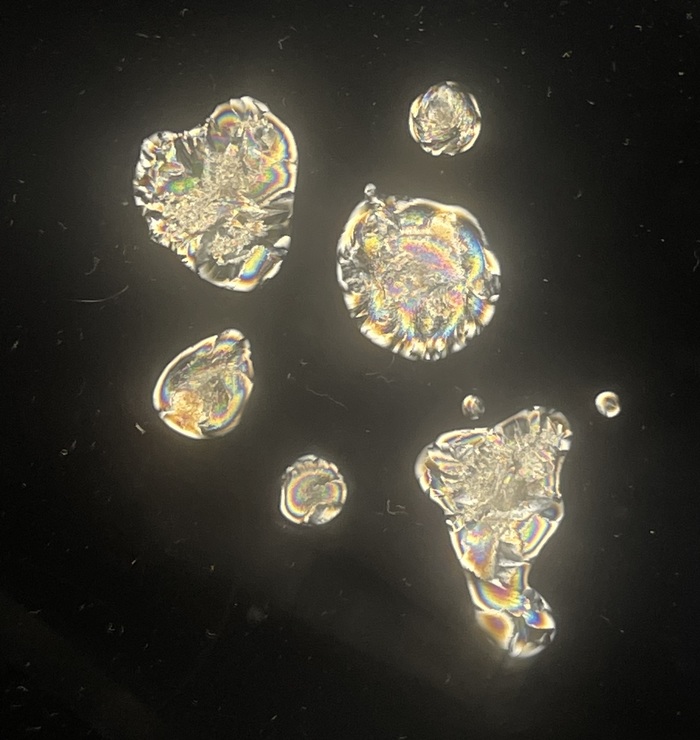Институт, по сравнению с тем, где я учусь в России, совсем небольшой, однако очень хорошо оснащен оборудованием как для обучения, так и для науки. Мы занимаемся исследованиями, связанными с морским льдом, а курс арктических технологий предполагает также образовательную программу по вечномёрзлым грунтам. В качестве примера поделюсь фотографией среза льда и капель замерзшей воды, через которые проходит поляризованный свет. На них, благодаря эффекту двойного лучепреломления, видна неоднородная структура морского льда. А на срезе можно также заметить и изучить эту структуру. понять принципы его нарастания и следующих из этого характеристик морского льда.