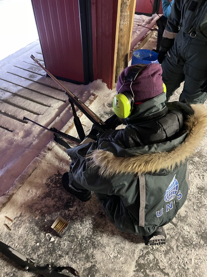 Главной целью разрешения ситуации встречи с белым медведем для нас является покинуть опасную зону. Для этого надо четко понимать окружающую обстановку, размер группы и настрой медведя. Медведи в основном водятся в прибрежной зоне, на пляже или на морском льду(напоминаю, что мы тут занимаемся изучением морского льда на... берегу или льду!). Соответственно, встретив медведя около берега первым делом надо собраться в тесную группу и начать двигаться от берега в сторону холмов, гор. Медведь, при этом, может быть как заинтересован вами, так и оставить вас без внимания. Во втором случае сразу при обнаружении медведя достаются и заряжаются сигнальные пистолеты, в первом, готовятся винтовки.