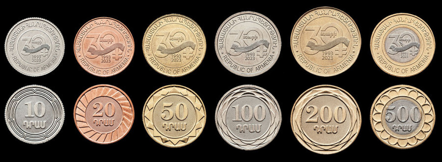 На аверсе всех монет даты обращения драма 1993 - 2023, символ драма ֏ и цифра 30. Государство эмитент - Республика Армения.