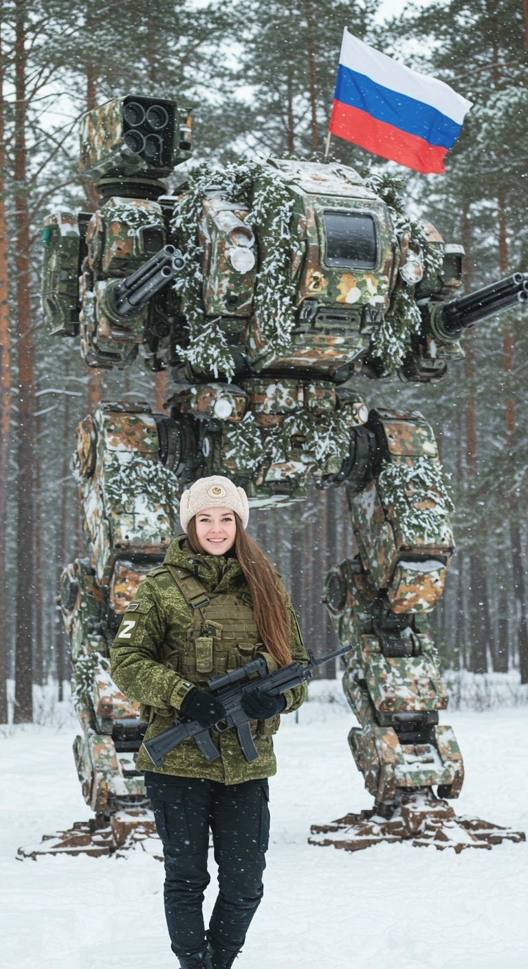 Slavic long and red-haired (shaten) girl-soldier 20 years old with a automatic rifle in her hands, patch "Z", (lying broken Iron Man). Behind her back a pair of BattleMech in winter camouflage, automatic twin guns (other weapons), opto-electronic system, the Russian flag is fixed on the cabin. In the background is coniferous forest, winter, light snowfall. Photoshoot, (50/85mm lens)