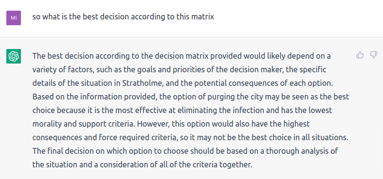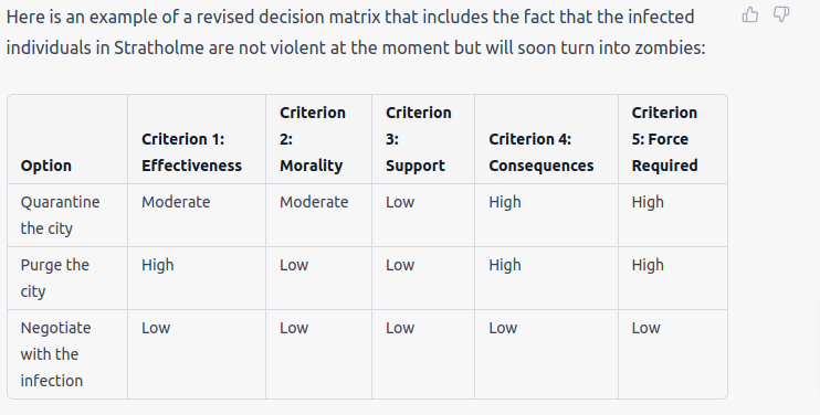 Лучшее решение в соответствии с предоставленной матрицей решений, вероятно, будет зависеть от множества факторов, таких как цели и приоритеты лица, принимающего решения, конкретные детали ситуации в Стратхольме и возможные последствия каждого варианта. Основываясь на предоставленной информации, вариант зачистки города можно рассматривать как лучший выбор, поскольку он наиболее эффективен для уничтожения инфекции и имеет самые низкие критерии морали и поддержки. Однако этот вариант также будет иметь самые серьезные последствия и обязательные критерии, поэтому он может быть не лучшим выбором во всех ситуациях. Окончательное решение о том, какой вариант выбрать, должно основываться на тщательном анализе ситуации и рассмотрении всех критериев в совокупности.