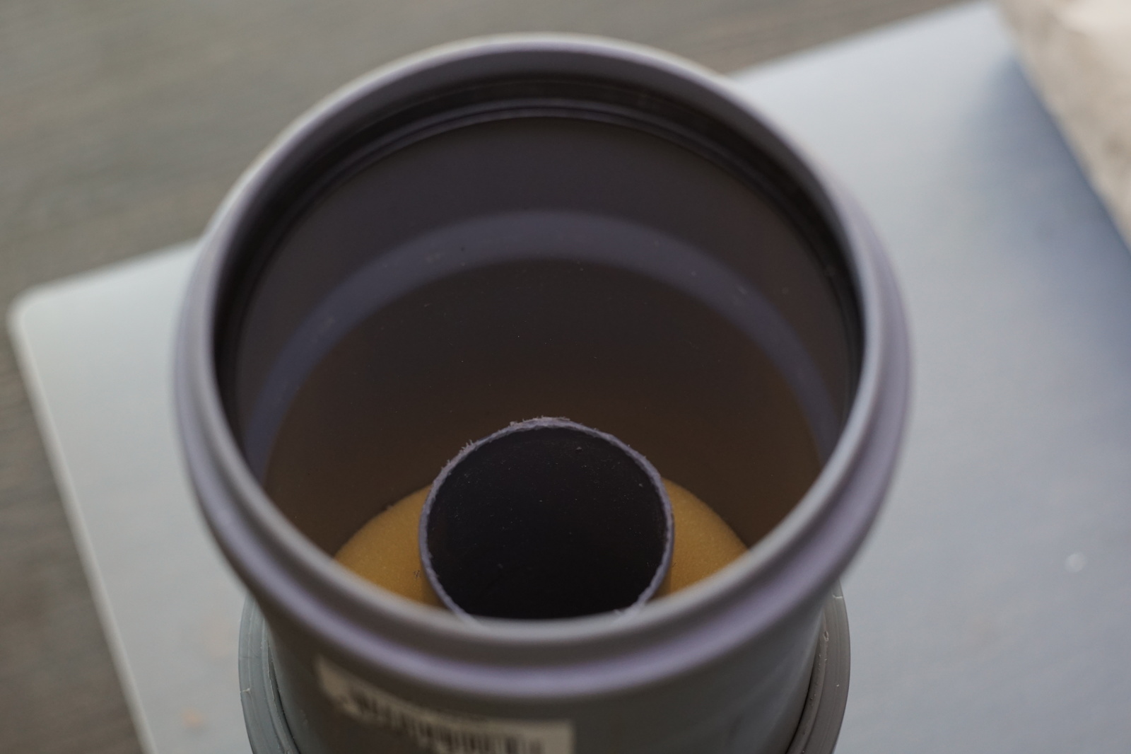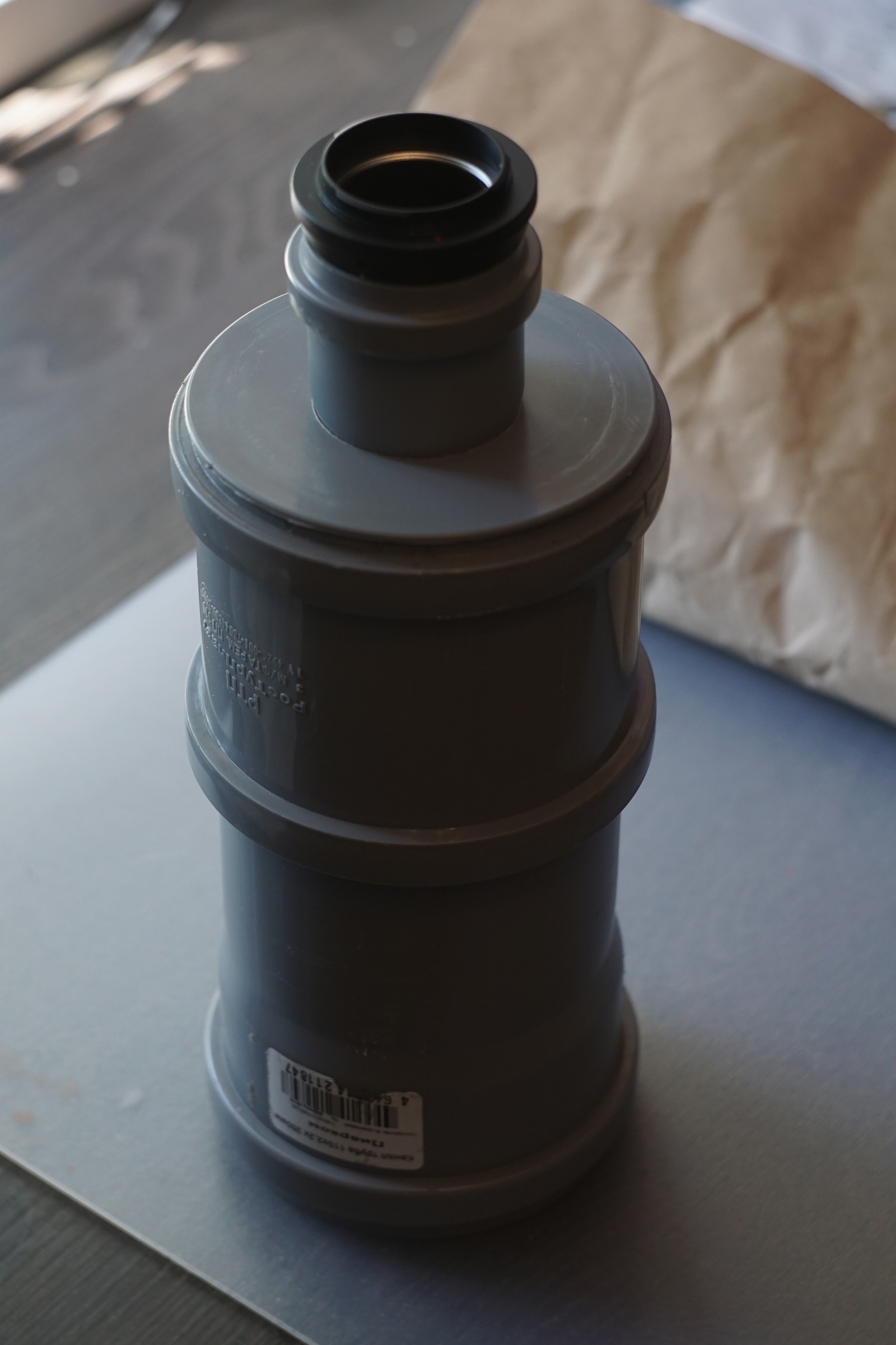 Естественно сразу захотелось испытать его и прилепить на фотоаппарат. И в течении получаса, путем нехитрых измерений, методом научного тыка, из говна, палок, поролона, и канализационных труб, был сварганен примитивный фокусер.