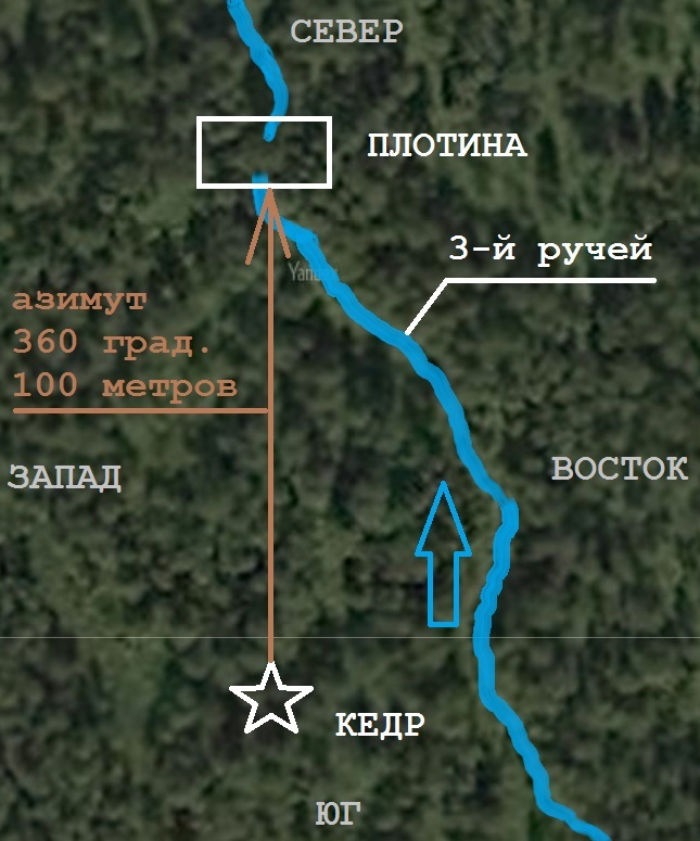 На тот случай, если по каким-то причинам вдруг выйдет из строя навигатор, ниже дан истинный азимут от кедра на плотину - 360 град. и расстояние 100 метров.