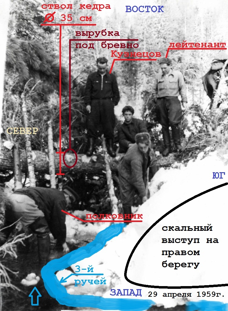 На этом снимке мы видим больше всего характерных признаков внушительного рукотворного создания поисковиков во главе с полковником Ортюковым. Прежде всего это ствол кедра, который легко определяется по его хвое, причем ветки у него срублены только посередине, где будут впоследствии установлены березовые бревна. Рос он на левом берегу третьего ручья, это видно по сужению ствола кедра, на левом берегу он заметно толще, чем на правом, то есть его пень остался на левом берегу третьего ручья. Также на стволе поваленного кедра хорошо видны вырубки от топора для установки в эти гнезда березовых бревен, этих вырубок как минимум шесть штук, что хорошо видно на представленном фото. На стволе стоит студент-поисковик из УПИ Кузнецов, его рост около 170 см и поэтому мы легко определили толщину ствола кедра для плотины недалеко от него, она оказалась равной примерно 35 см. Так же здесь мы видим, что довольно высокие и крутые берега третьего ручья подходят довольно близко друг к другу, примерно на 3 метра. Сам ручей довольно мелкий в этом месте, так как рыбацкие сапоги с отворотами на полковнике утопают в воде всего лишь по щиколотку. Сам ствол кедра находится от уровня воды на высоте около метра. А учитывая то, что это все строили в конце апреля и был пик половодья, то можно смело утверждать, что этот ствол кедра не смоет никакой весенний потоп. Ну и самые главные ориентиры его местонахождения являются природными. Ручей возле плотины делает характерный зигзаг, сначала он течет на север, перед плотиной резко поворачивает на восток, а после плотины снова резво поворачивает на север. Также на фото на переднем плане впечатляюще выглядит снежный сугроб. Хотя вокруг снег лежит на земле уже тонким слоем, здесь его высота огромна. Но это всего лишь оптический обман, здесь не снега много, а находится скальный выступ на правом берегу ручья и тонкий слой снега на нем создает иллюзию его большого объема. Эти два природных ориентира на месте строительства плотины являются самыми надежными и сохранятся на века, через 100-200 лет ствол кедра сгниет, а зигзаг ручья и скальный выступ останутся.