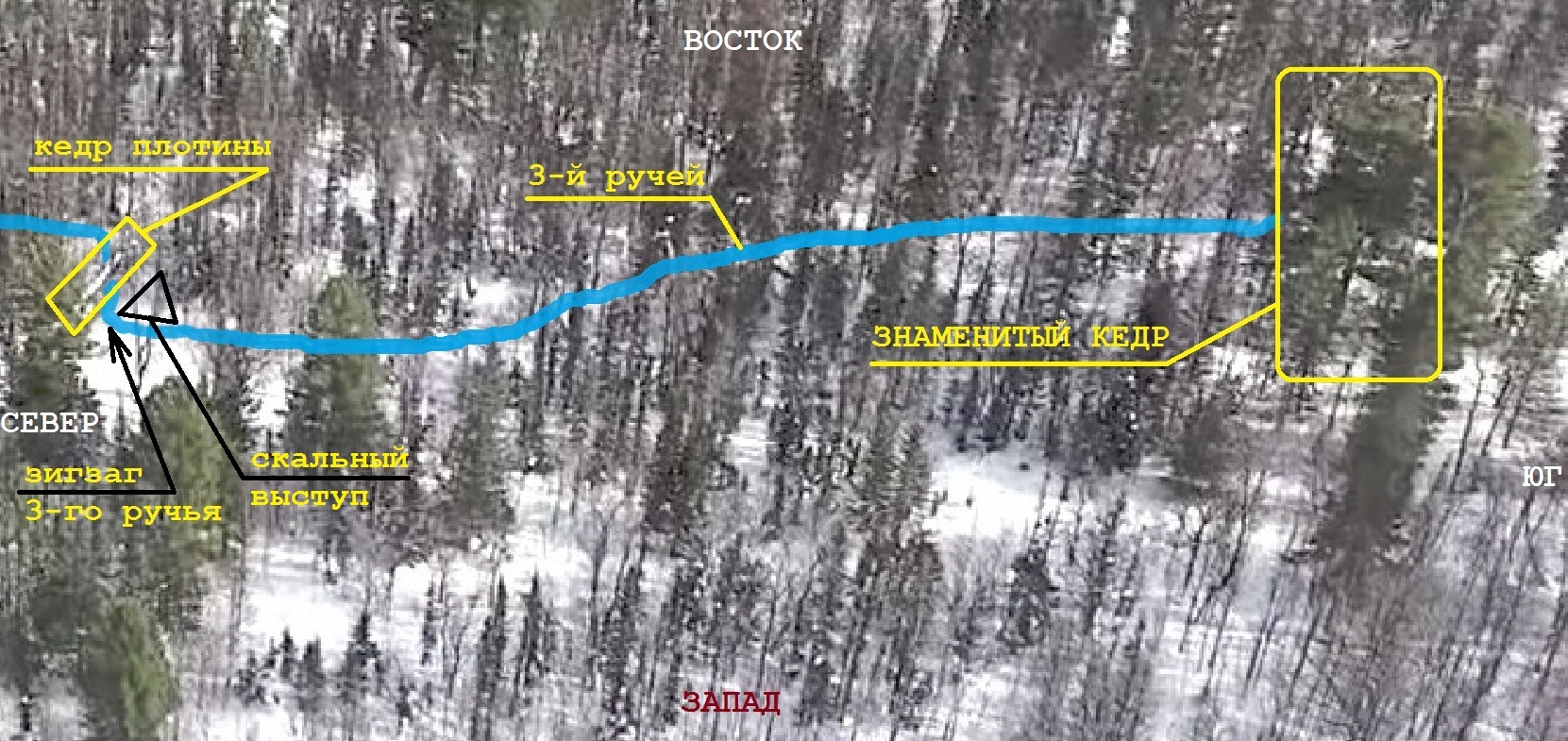 Здесь мы хорошо видим знаменитый кедр и поваленный ствол кедра на месте установки плотины. Так же наблюдается зигзаг третьего ручья, скальный выступ покрыт снегом и показан здесь условно. Но любой турист летом может потрогать его руками, убедившись в его реальном существовании.