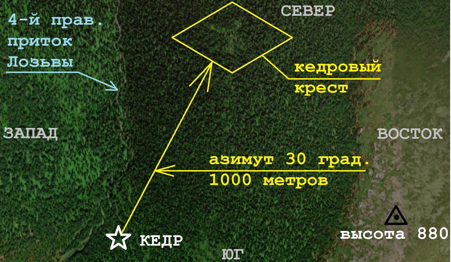 Истинный азимут от кедра на "кедровый крест" составляет 30 градуса и расстояние 1000 метров.
