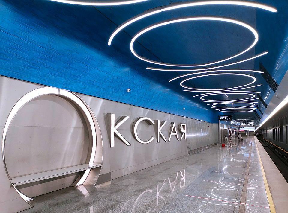 Станция, открытая в 2020 году на Некрасовской линии, носит имя Окской улицы, которая, в свою очередь, названа в честь реки Оки. В дизайне станции прослеживается водная тематика. Архитекторы использовали синие оттенки, которые гармонично сочетаются с серым и черным цветами. Центральной темой оформления стали круги на воде. Об этом напоминают потолочные светильники — кольца разных размеров, выполненные из светодиодов. Самый крупный светящийся круг достигает почти пяти метров в диаметре. Эти конструкции установлены на алюминиевом потолке с темно-синим покрытием, имитирующим движение водной глади. Стены, выполненные в светло-сером цвете из керамогранита, и пол из гранита того же оттенка дополняют общую картину.