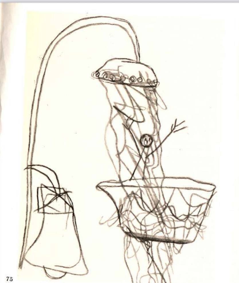 Слева видно наслоение четырех фигур людей, объединенных одной головой. Рядом несколько ракет, спутников, перечеркнутых, наслаивающихся друг на друга. В центре внизу уродливая фигура головонога с огромными ушами. Справа внизу у человека настолько огромные черные уши, что вся фигура имеет форму бабочки. Справа символическая фигура человека. Весь рисунок больной назвал «Узор на ковре». В действительности же это хаотическая смесь уродливых, незавершенных, символических фигур и предметов. Подобные рисунки наиболее типичны для страдающих шизофренией.