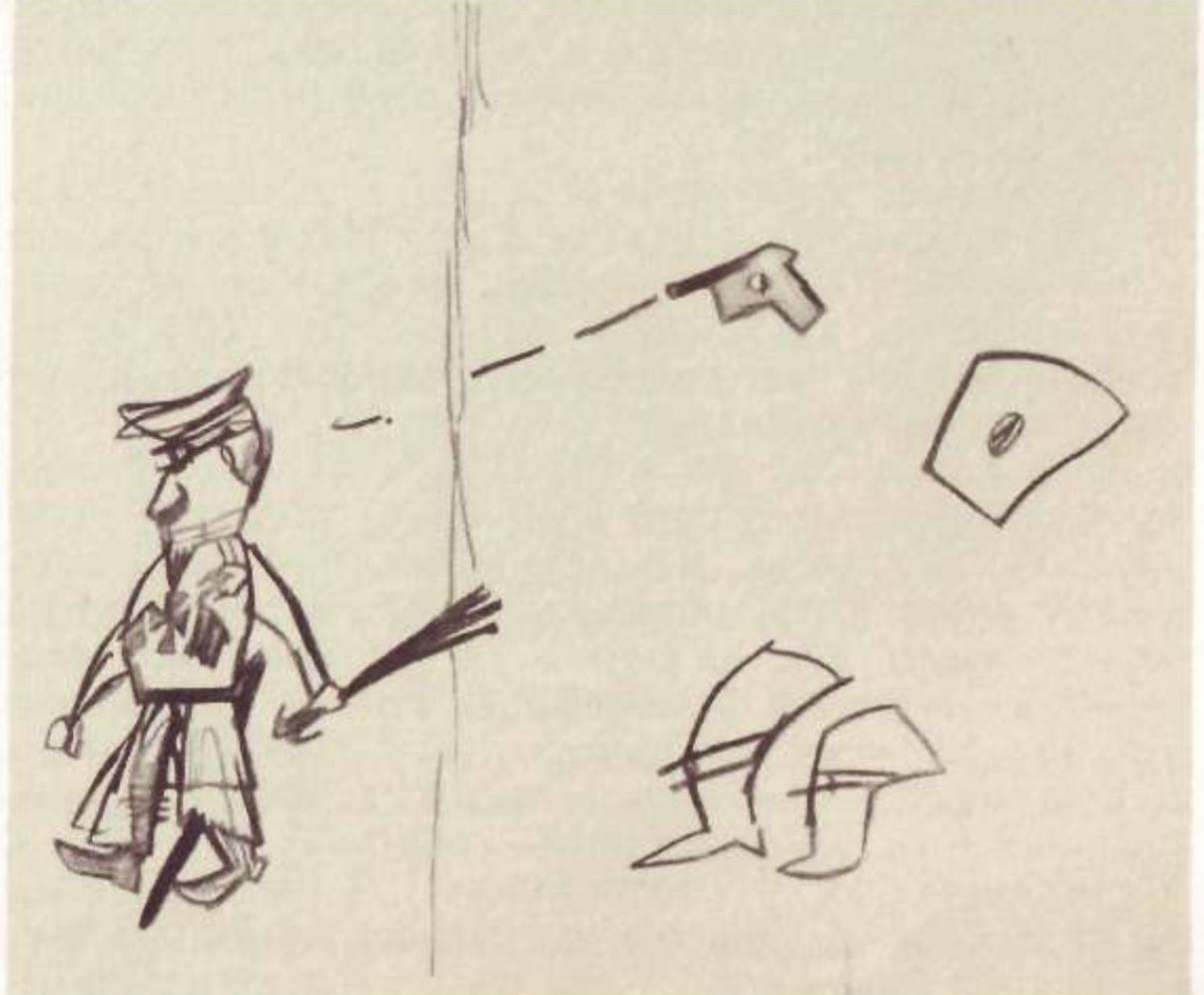 Представлены изолированные ноги в сапогах, символическая голова, а туловище и руки отсутствуют. Здоровые дети рисуют оружие в руках человека. Здесь же пистолет представлен изолированно и к тому же стреляет. На этом же листе бумаги слева изображен без существенных дефектов кавалерист с саблей и крестом.