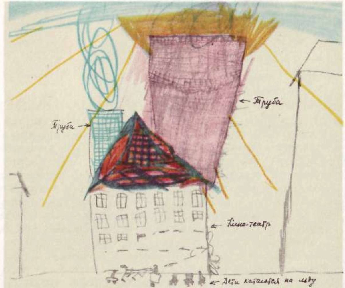 На передний план выдвинута труба (справа). Она необычных размеров, почти такая же, как все здание, закрывает солнце. Ей уделено много внимания. Мальчик долго рисовал трубу, разделял ее на мельчайшие фрагменты, с увлечением говорил: «Как много из нее выйдет дыма! Труба и дым заслонят солнце!», радовался этому. Детей, катающихся на льду (внизу), трудно различить.