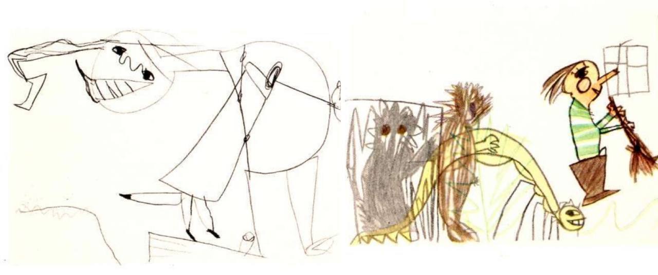Рисунки детей, больных шизофренией, отличаются диспропорцией: малые головы, огромные руки, нос, рот, может быть много лишних пальцев, рисунок часто остается незавершенным.
