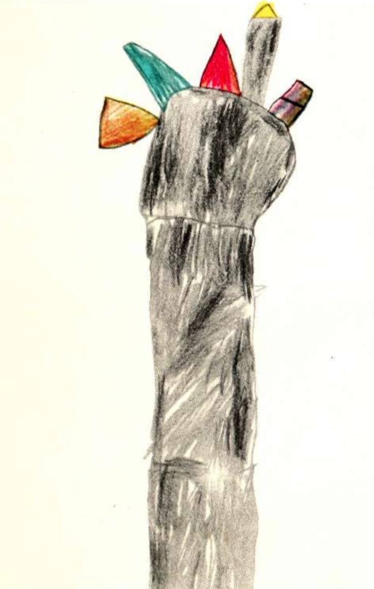 Мальчик по просьбе врачей нарисовал свою галлюцинацию — «руку». Сообщил, что видел ее до локтевого сустава. Рука всегда была черная, страшная, пальцы необычные, каждый своеобразной формы, разного цвета: большой палец светло-коричневый, указательный — синий, средний — красный, безымянный — черный с желтым ногтем, мизинец — темно-коричневый.