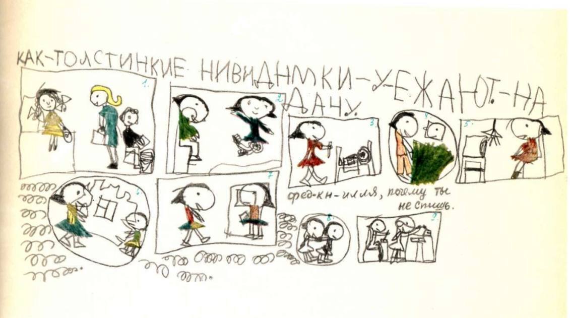 Наташа при обследовании была растеряна, что-то отгоняла от себя, просила освободить ее от «плохой» девочки. Рассказывала о «невидимках», настолько маленьких, что увидеть их может только внимательный человек или через микроскоп. Раздражалась, когда ее невнимательно слушали. И охотно комментировала свое творчество. На всех рисунках изображала исключительно «невидимок»: «Невидимки уезжают на дачу», «Бал у невидимок», «Невидимки идут на работу».