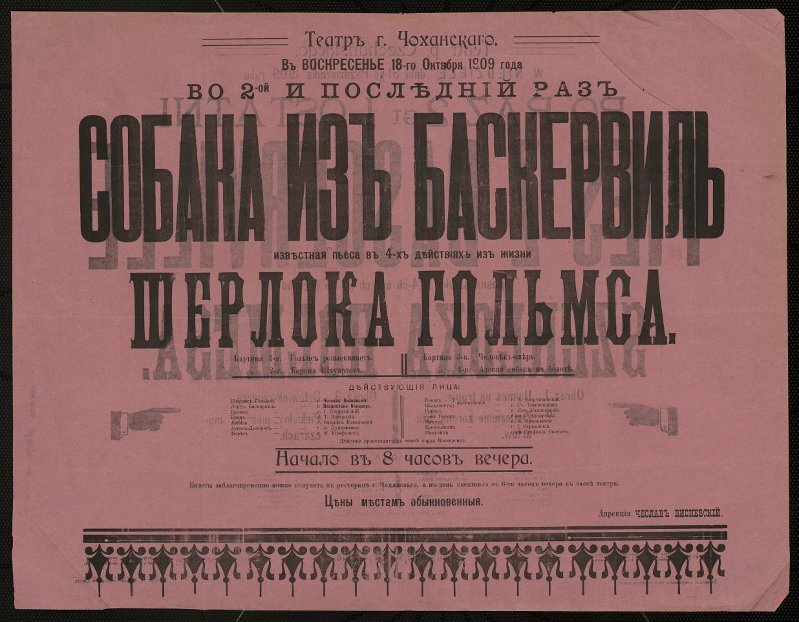 Афиша. "Собака Баскервилей" (Название на афише - "Баскервильская собака". Режиссер - Белоконь И.И.); ". Калуга. Городской театр; .. Дирекция А.Л. Миролюбова. 4 ноября 1907 г.