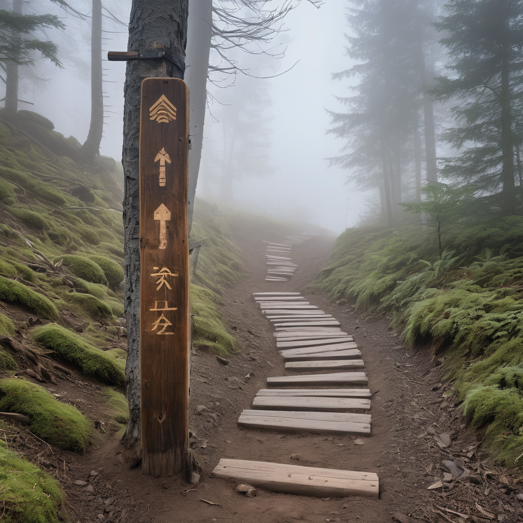 Промт: A narrow mountain trail with a wooden signpost, fog rolling between the trees, traces of recent footsteps in the dirt, no people, quiet tension in the air.