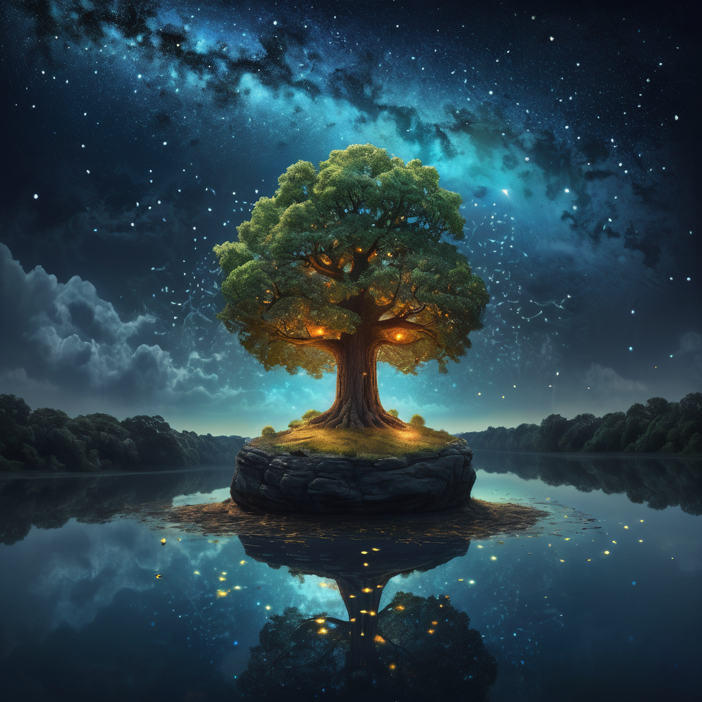 Промт: A floating stone island with a single oak tree growing in the middle, surrounded by glowing fireflies, starry night sky above, endless void below.