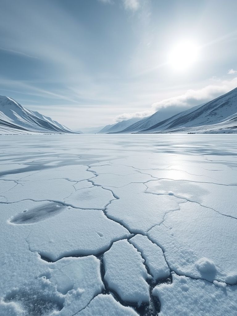 Промт: A frozen mountain lake under a pale winter sun, cracks in the thick ice, distant peaks covered in snow, wind blowing snowdrifts — hyper-realistic, sharp cold palette.