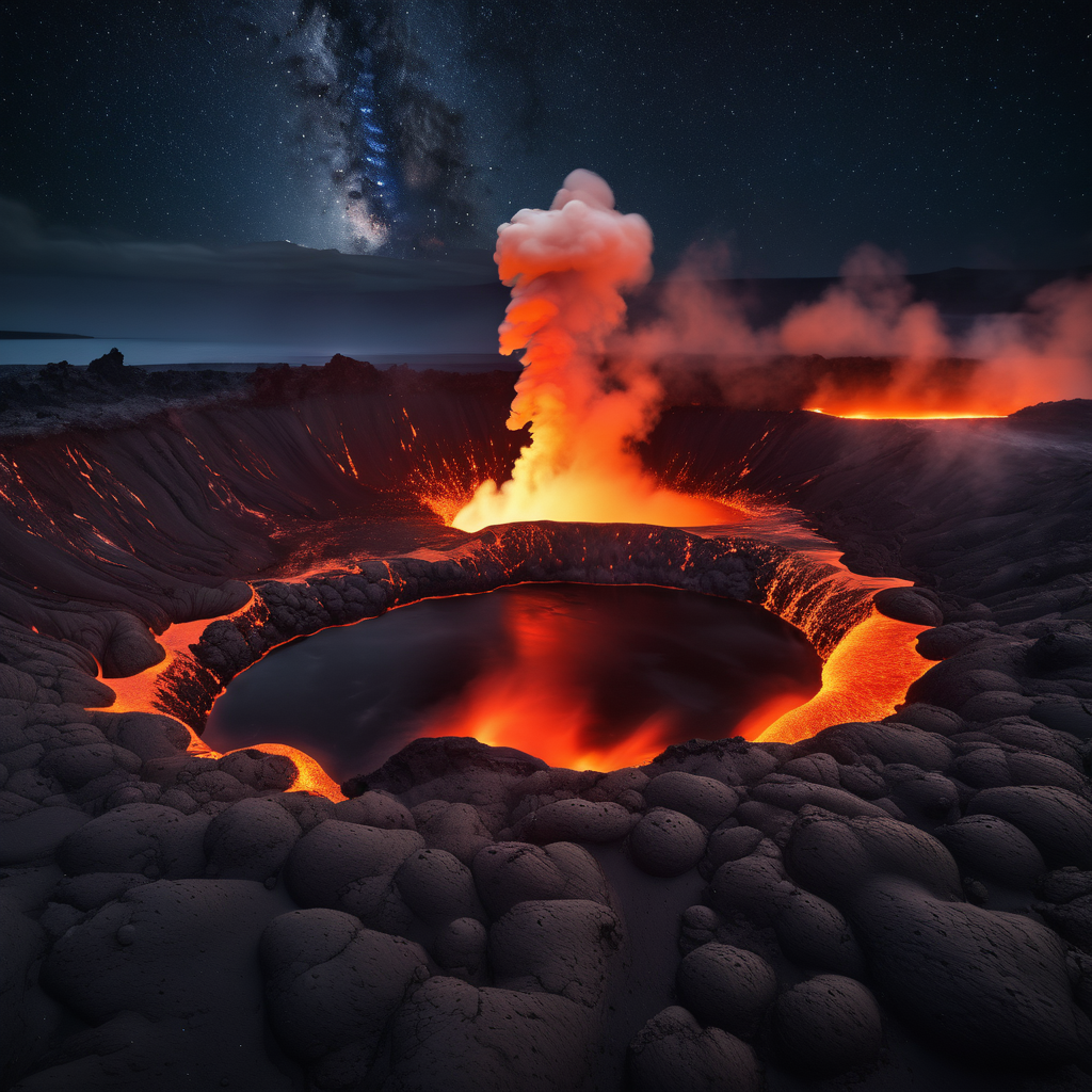 Промт: A glowing lava lake bubbles deep inside a volcanic crater under a starry sky. Steam rises in swirling plumes, and the red-orange glow reflects off black volcanic rock. Distant lightning flickers on the horizon. Dramatic, surreal, intense atmosphere.