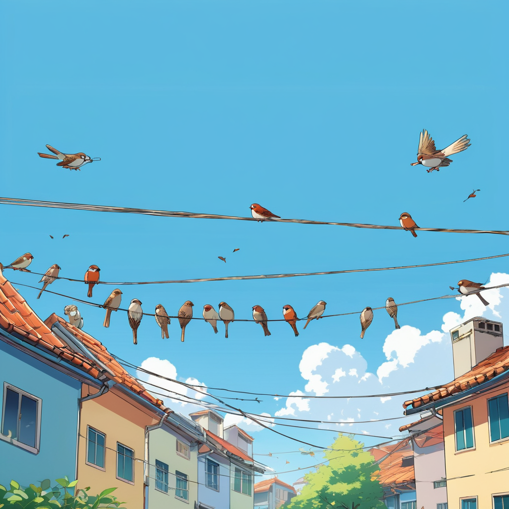 Промт: Several anime-style sparrows perch on a long telephone wire against a clear blue sky. Below — tiled rooftops and laundry fluttering in the breeze. One sparrow pecks at a leaf caught on the wire. Peaceful, lighthearted summer day.