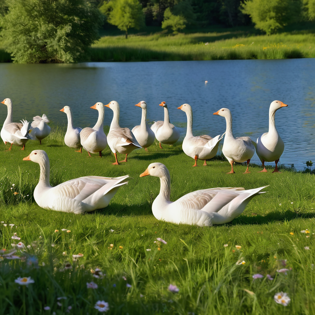 Промт: Flock of white geese grazing peacefully on a lush green meadow near a serene pond, under a clear blue sky. The sun is shining brightly, casting soft, warm light across the landscape. Wildflowers scattered in the grass, gentle ripples on the pond’s surface reflecting the sky. Trees in the background sway slightly in a summer breeze. Some geese are standing, others sitting or dipping their beaks into the water. Natural, vibrant colors, highly detailed, photorealistic.