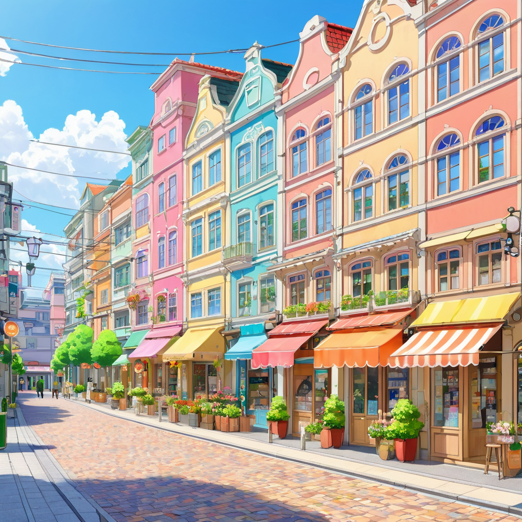 Промт: A beautiful and vibrant anime-style city street on a sunny day. The street is lined with a mix of charming buildings — colorful houses, cozy cafés, small boutiques, and apartments — each with unique architectural details, signage, balconies, and flower boxes. Vending machines, bicycles parked neatly, street lamps, and utility poles with tangled wires add life to the scene. The asphalt is clean, with painted crosswalks and shadows from awnings and trees. Potted plants and bright advertisements decorate the storefronts. The sky is blue with a few fluffy clouds, casting soft, warm light across the buildings. No people are present, giving the street a calm and peaceful atmosphere, like a quiet moment in a slice-of-life anime.